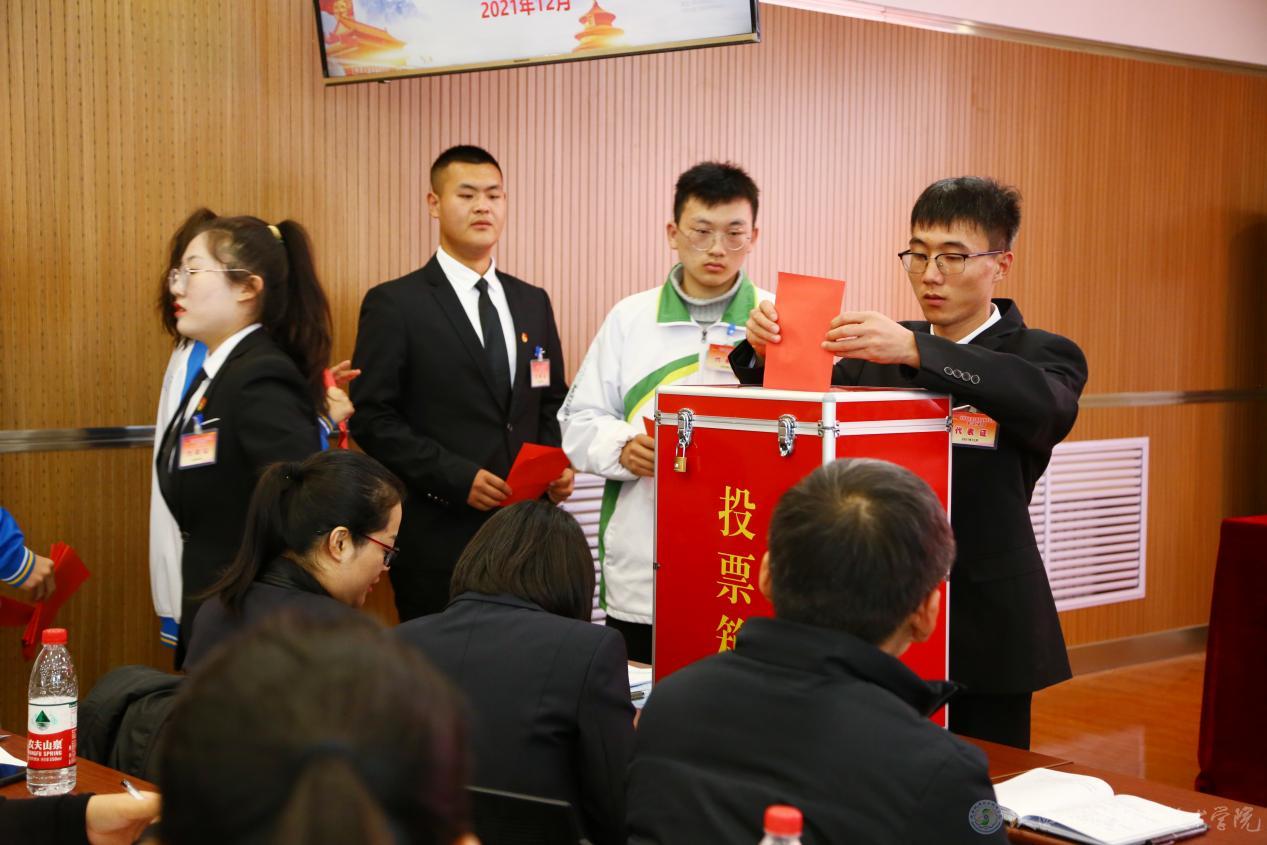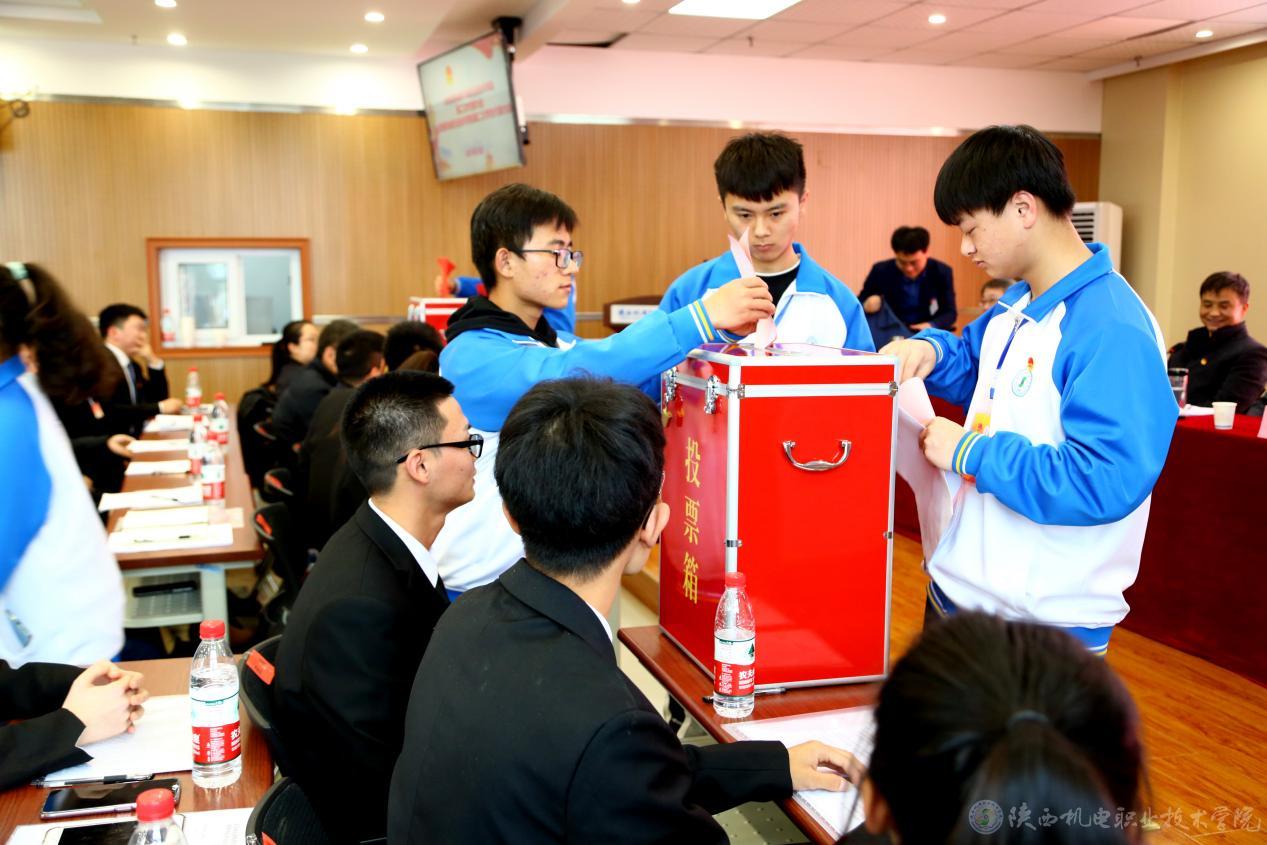 大会以无记名投票的方式,经过差额选举, 选举杨鹏等11位同志为共青团陕西机电职业技术学院第二届委员会委员;选举张豪等11位同学为陕西机电职业技术学院第二届学生会委员会委员;选举郭恒飞等4位同学为陕西机电职业技术学院新一届学生会主席团成员。大会通过了共青团陕西机电职业技术学院第二次代表大会工作报告决议(草案)、陕西机电职业技术学院第二次学生代表大会工作报告决议(草案)。