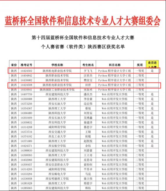 2023年4月8日,国家工业和信息化部举办的第十四届蓝桥杯陕西省省赛在宝鸡文理学院举行。陕西机电职业技术学院电子与信息学院厚溥IT软件学院 严鑫 老师指导的 歹飞飞、田祥 同学分别获省赛一等奖、三等奖的好成绩,其中歹飞飞同学取得国赛参赛资格。