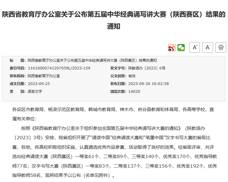 雅言传承文明,经典浸润人生。陕西省中华经典诵读大赛举办以来,我校高度重视、积极推动、广泛开展,为弘扬中华优秀传统文化,激发广大师生学经典、诵经典、用经典的热情提供了优质平台。本次比赛获奖,是我校始终坚持传承中华优秀传统文化,将文化育人贯穿教育教学全过程的丰硕成果。