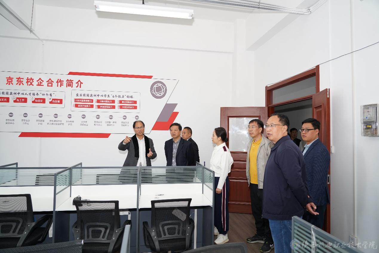 考察组在学校领导的陪同下参观了我校风标产业学院、京东数字处理产业基地、无人机产业学院、擀面皮产业学院,目前建成4个智能制造特色产业学院、1个地方特色产业学院,各产业学院成立以来,取得了一系列成果,学校对“园、校、企”产教融合研究,经过近年来不断探索,在专业建设、师资建设、人才培养质量等方面均得到了提高。